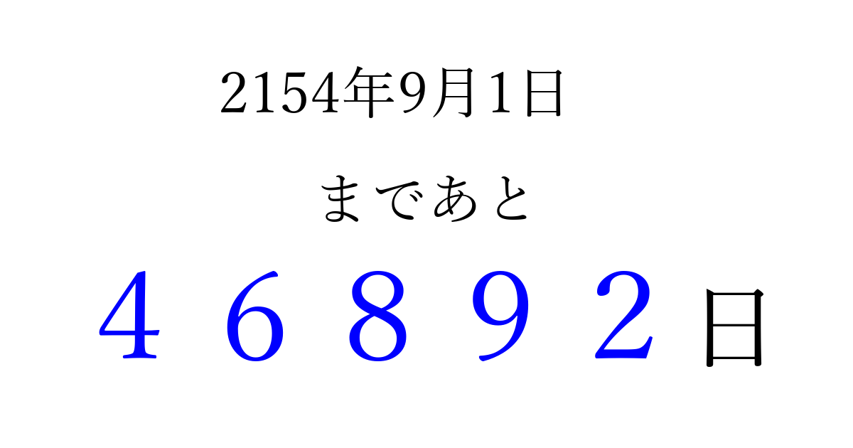 2154年9月1日(日)まで あと 99999 日です 追加すると、トップページからすぐ選べるようになります ※2026/04/13現在の結果です。 最新の状態に更新する ↓シェアして、タイムライン上にカウントダウンを表示しよう!↓ 📤 この結果を共有する Tweet シェア Threads Bluesky 別の日付でカウントダウン 2154年9月のカレンダー このページをブックマークに追加すると、いつでもカウントダウンを確認できます。 (PC: Ctrl+D / Mac: ⌘+D) hitome-notes.comでは以下のページも運営しています。 指定日と期間から日付を計算 | ガチャ確率計算・シミュレーション | プライバシー・ポリシー 運営者:Avocado