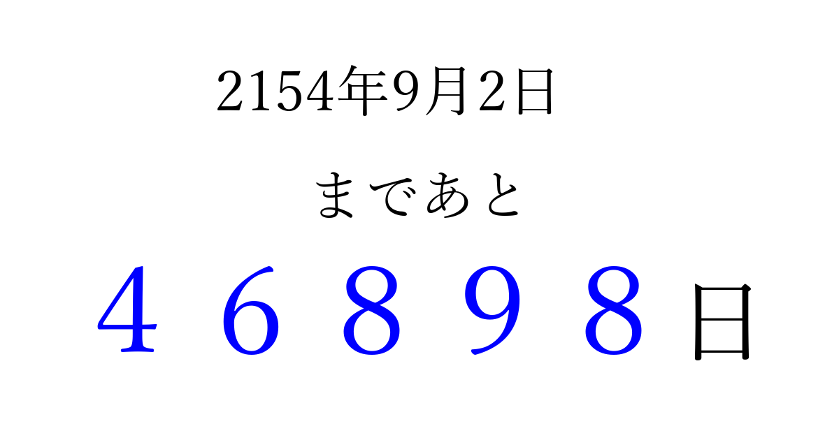 2154年9月2日(月)まで あと 99999 日です 追加すると、トップページからすぐ選べるようになります ※2026/04/08現在の結果です。 最新の状態に更新する ↓シェアして、タイムライン上にカウントダウンを表示しよう!↓ 📤 この結果を共有する Tweet シェア Threads Bluesky 別の日付でカウントダウン 2154年9月のカレンダー このページをブックマークに追加すると、いつでもカウントダウンを確認できます。 (PC: Ctrl+D / Mac: ⌘+D) hitome-notes.comでは以下のページも運営しています。 指定日と期間から日付を計算 | ガチャ確率計算・シミュレーション | プライバシー・ポリシー 運営者:Avocado