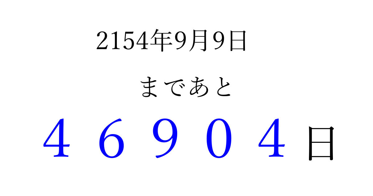 2154年9月9日(月)まで あと 99999 日です 追加すると、トップページからすぐ選べるようになります ※2026/04/09現在の結果です。 最新の状態に更新する ↓シェアして、タイムライン上にカウントダウンを表示しよう!↓ 📤 この結果を共有する Tweet シェア Threads Bluesky 別の日付でカウントダウン 2154年9月のカレンダー このページをブックマークに追加すると、いつでもカウントダウンを確認できます。 (PC: Ctrl+D / Mac: ⌘+D) hitome-notes.comでは以下のページも運営しています。 指定日と期間から日付を計算 | ガチャ確率計算・シミュレーション | プライバシー・ポリシー 運営者:Avocado