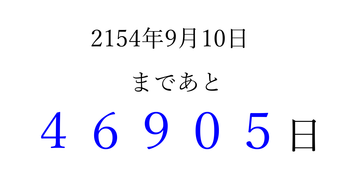 2154年9月10日(火)まで あと 99999 日です 追加すると、トップページからすぐ選べるようになります ※2026/04/09現在の結果です。 最新の状態に更新する ↓シェアして、タイムライン上にカウントダウンを表示しよう!↓ 📤 この結果を共有する Tweet シェア Threads Bluesky 別の日付でカウントダウン 2154年9月のカレンダー このページをブックマークに追加すると、いつでもカウントダウンを確認できます。 (PC: Ctrl+D / Mac: ⌘+D) hitome-notes.comでは以下のページも運営しています。 指定日と期間から日付を計算 | ガチャ確率計算・シミュレーション | プライバシー・ポリシー 運営者:Avocado