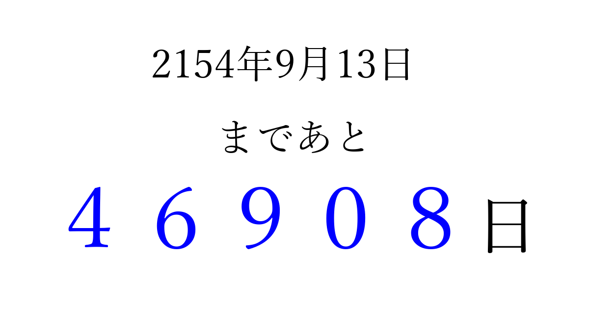 2154年9月13日(金)まで あと 99999 日です 追加すると、トップページからすぐ選べるようになります ※2026/04/09現在の結果です。 最新の状態に更新する ↓シェアして、タイムライン上にカウントダウンを表示しよう!↓ 📤 この結果を共有する Tweet シェア Threads Bluesky 別の日付でカウントダウン 2154年9月のカレンダー このページをブックマークに追加すると、いつでもカウントダウンを確認できます。 (PC: Ctrl+D / Mac: ⌘+D) hitome-notes.comでは以下のページも運営しています。 指定日と期間から日付を計算 | ガチャ確率計算・シミュレーション | プライバシー・ポリシー 運営者:Avocado
