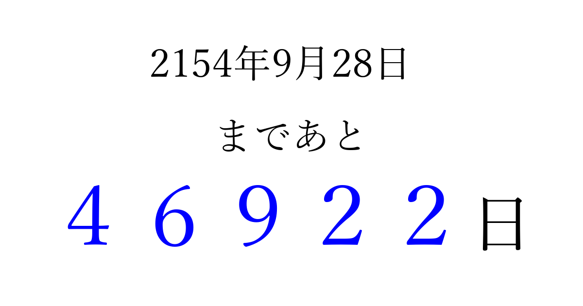 2154年9月28日(土)まで あと 99999 日です 追加すると、トップページからすぐ選べるようになります ※2026/04/10現在の結果です。 最新の状態に更新する ↓シェアして、タイムライン上にカウントダウンを表示しよう!↓ 📤 この結果を共有する Tweet シェア Threads Bluesky 別の日付でカウントダウン 2154年9月のカレンダー このページをブックマークに追加すると、いつでもカウントダウンを確認できます。 (PC: Ctrl+D / Mac: ⌘+D) hitome-notes.comでは以下のページも運営しています。 指定日と期間から日付を計算 | ガチャ確率計算・シミュレーション | プライバシー・ポリシー 運営者:Avocado