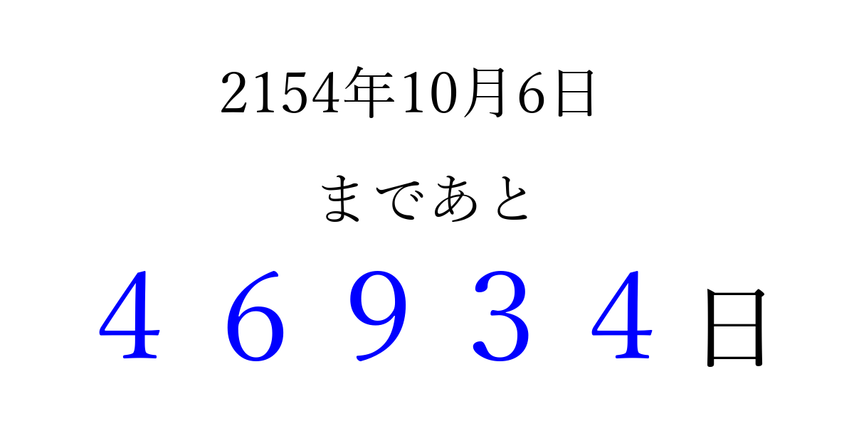 2154年10月6日(日)まで あと 99999 日です 追加すると、トップページからすぐ選べるようになります ※2026/04/06現在の結果です。 最新の状態に更新する ↓シェアして、タイムライン上にカウントダウンを表示しよう!↓ 📤 この結果を共有する Tweet シェア Threads Bluesky 別の日付でカウントダウン 2154年10月のカレンダー このページをブックマークに追加すると、いつでもカウントダウンを確認できます。 (PC: Ctrl+D / Mac: ⌘+D) hitome-notes.comでは以下のページも運営しています。 指定日と期間から日付を計算 | ガチャ確率計算・シミュレーション | プライバシー・ポリシー 運営者:Avocado