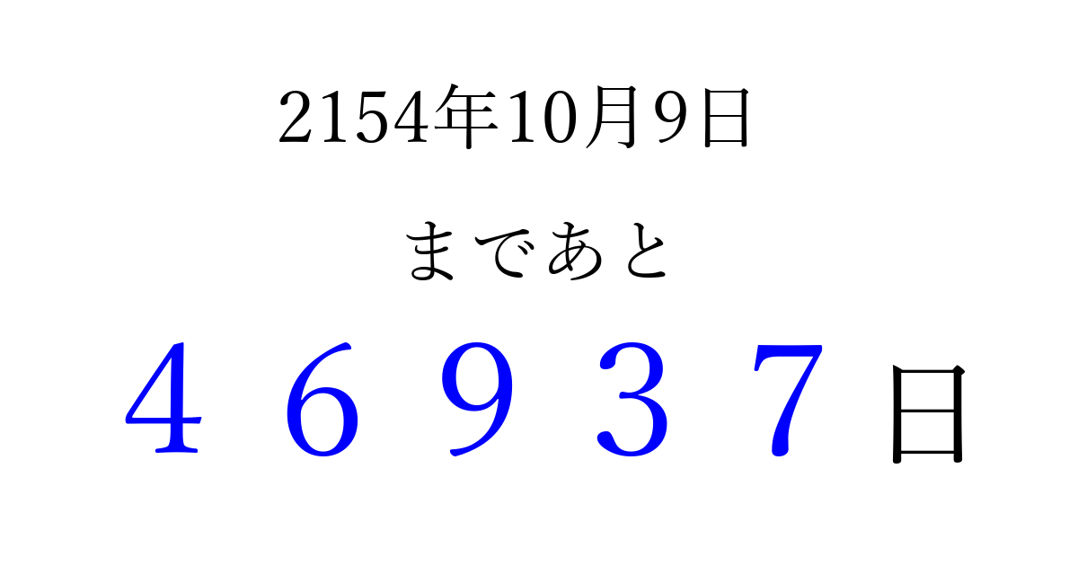 2154年10月9日(水)まで あと 99999 日です 追加すると、トップページからすぐ選べるようになります ※2026/04/06現在の結果です。 最新の状態に更新する ↓シェアして、タイムライン上にカウントダウンを表示しよう!↓ 📤 この結果を共有する Tweet シェア Threads Bluesky 別の日付でカウントダウン 2154年10月のカレンダー このページをブックマークに追加すると、いつでもカウントダウンを確認できます。 (PC: Ctrl+D / Mac: ⌘+D) hitome-notes.comでは以下のページも運営しています。 指定日と期間から日付を計算 | ガチャ確率計算・シミュレーション | プライバシー・ポリシー 運営者:Avocado