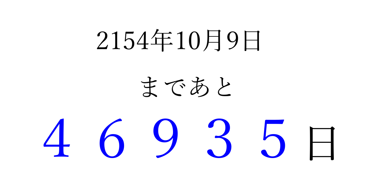 2154年10月9日(水)まで あと 99999 日です 追加すると、トップページからすぐ選べるようになります ※2026/04/08現在の結果です。 最新の状態に更新する ↓シェアして、タイムライン上にカウントダウンを表示しよう!↓ 📤 この結果を共有する Tweet シェア Threads Bluesky 別の日付でカウントダウン 2154年10月のカレンダー このページをブックマークに追加すると、いつでもカウントダウンを確認できます。 (PC: Ctrl+D / Mac: ⌘+D) hitome-notes.comでは以下のページも運営しています。 指定日と期間から日付を計算 | ガチャ確率計算・シミュレーション | プライバシー・ポリシー 運営者:Avocado