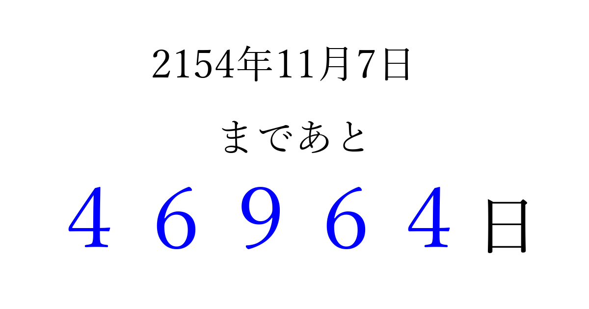 2154年11月7日(木)まで あと 99999 日です 追加すると、トップページからすぐ選べるようになります ※2026/04/08現在の結果です。 最新の状態に更新する ↓シェアして、タイムライン上にカウントダウンを表示しよう!↓ 📤 この結果を共有する Tweet シェア Threads Bluesky 別の日付でカウントダウン 2154年11月のカレンダー このページをブックマークに追加すると、いつでもカウントダウンを確認できます。 (PC: Ctrl+D / Mac: ⌘+D) hitome-notes.comでは以下のページも運営しています。 指定日と期間から日付を計算 | ガチャ確率計算・シミュレーション | プライバシー・ポリシー 運営者:Avocado