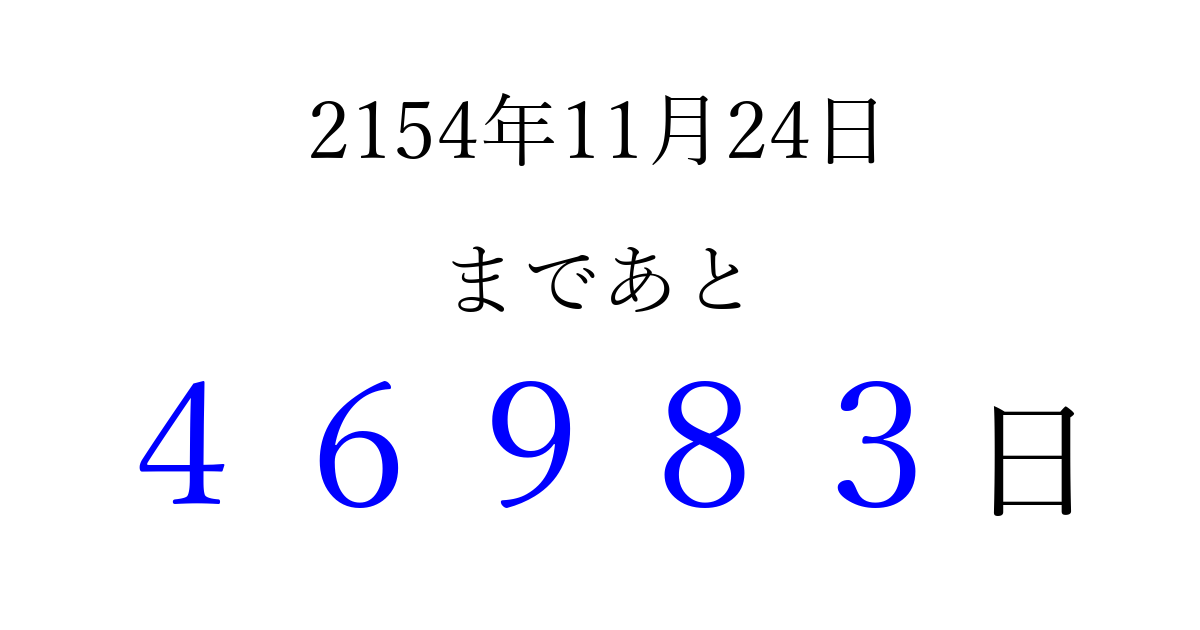 2154年11月24日(日)まで あと 99999 日です 追加すると、トップページからすぐ選べるようになります ※2026/04/06現在の結果です。 最新の状態に更新する ↓シェアして、タイムライン上にカウントダウンを表示しよう!↓ 📤 この結果を共有する Tweet シェア Threads Bluesky 別の日付でカウントダウン 2154年11月のカレンダー このページをブックマークに追加すると、いつでもカウントダウンを確認できます。 (PC: Ctrl+D / Mac: ⌘+D) hitome-notes.comでは以下のページも運営しています。 指定日と期間から日付を計算 | ガチャ確率計算・シミュレーション | プライバシー・ポリシー 運営者:Avocado