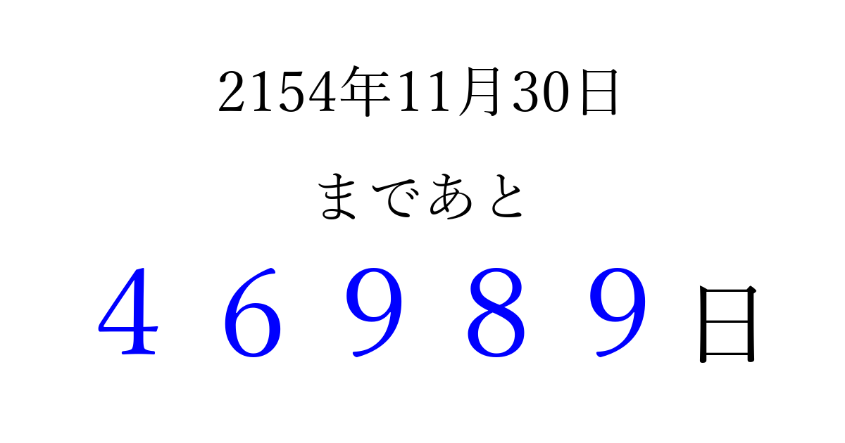 2154年11月30日(土)まで あと 99999 日です 追加すると、トップページからすぐ選べるようになります ※2026/04/06現在の結果です。 最新の状態に更新する ↓シェアして、タイムライン上にカウントダウンを表示しよう!↓ 📤 この結果を共有する Tweet シェア Threads Bluesky 別の日付でカウントダウン 2154年11月のカレンダー このページをブックマークに追加すると、いつでもカウントダウンを確認できます。 (PC: Ctrl+D / Mac: ⌘+D) hitome-notes.comでは以下のページも運営しています。 指定日と期間から日付を計算 | ガチャ確率計算・シミュレーション | プライバシー・ポリシー 運営者:Avocado