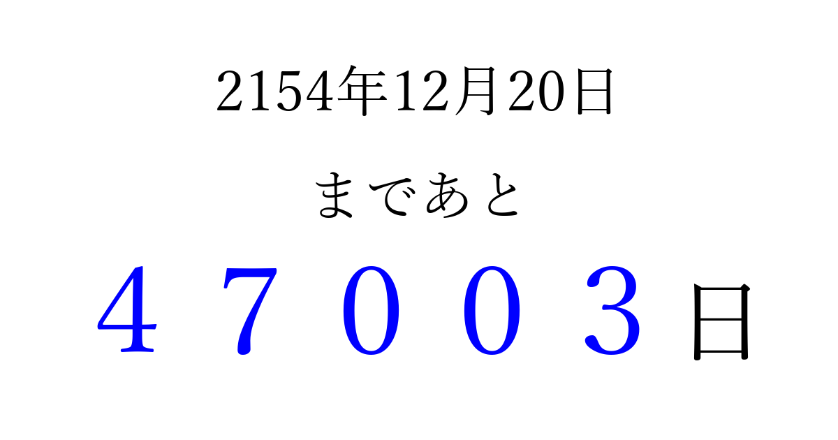 2154年12月20日(金)まで あと 99999 日です 追加すると、トップページからすぐ選べるようになります ※2026/04/12現在の結果です。 最新の状態に更新する ↓シェアして、タイムライン上にカウントダウンを表示しよう!↓ 📤 この結果を共有する Tweet シェア Threads Bluesky 別の日付でカウントダウン 2154年12月のカレンダー このページをブックマークに追加すると、いつでもカウントダウンを確認できます。 (PC: Ctrl+D / Mac: ⌘+D) hitome-notes.comでは以下のページも運営しています。 指定日と期間から日付を計算 | ガチャ確率計算・シミュレーション | プライバシー・ポリシー 運営者:Avocado