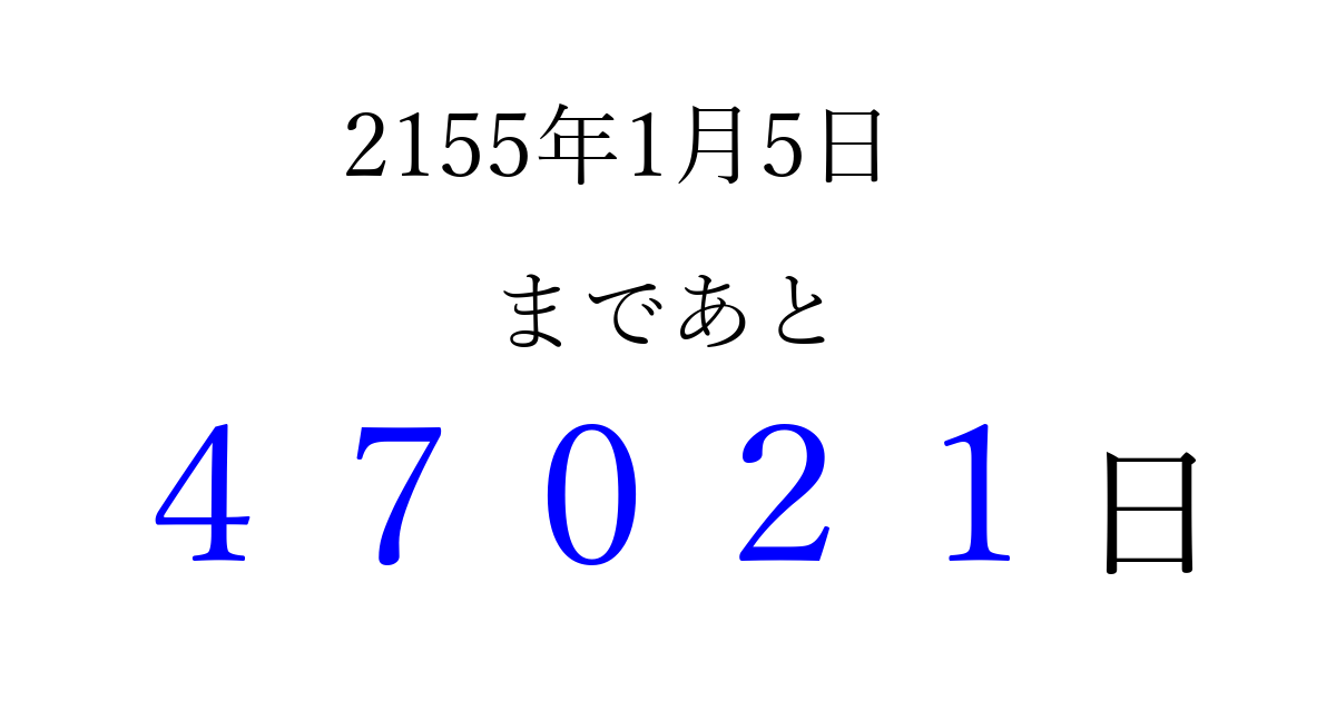 2155年1月5日(日)まで あと 99999 日です 追加すると、トップページからすぐ選べるようになります ※2026/04/10現在の結果です。 最新の状態に更新する ↓シェアして、タイムライン上にカウントダウンを表示しよう!↓ 📤 この結果を共有する Tweet シェア Threads Bluesky 別の日付でカウントダウン 2155年1月のカレンダー このページをブックマークに追加すると、いつでもカウントダウンを確認できます。 (PC: Ctrl+D / Mac: ⌘+D) hitome-notes.comでは以下のページも運営しています。 指定日と期間から日付を計算 | ガチャ確率計算・シミュレーション | プライバシー・ポリシー 運営者:Avocado