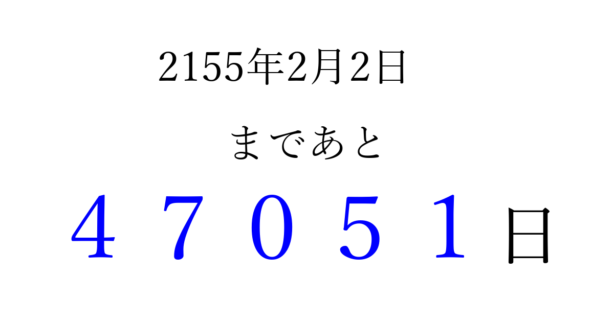 2155年2月2日(日)まで あと 99999 日です 追加すると、トップページからすぐ選べるようになります ※2026/04/08現在の結果です。 最新の状態に更新する ↓シェアして、タイムライン上にカウントダウンを表示しよう!↓ 📤 この結果を共有する Tweet シェア Threads Bluesky 別の日付でカウントダウン 2155年2月のカレンダー このページをブックマークに追加すると、いつでもカウントダウンを確認できます。 (PC: Ctrl+D / Mac: ⌘+D) hitome-notes.comでは以下のページも運営しています。 指定日と期間から日付を計算 | ガチャ確率計算・シミュレーション | プライバシー・ポリシー 運営者:Avocado