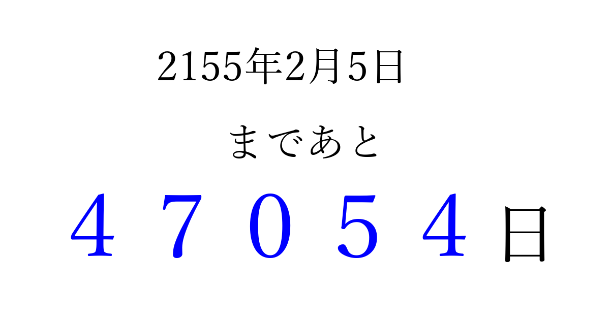 2155年2月5日(水)まで あと 99999 日です 追加すると、トップページからすぐ選べるようになります ※2026/04/08現在の結果です。 最新の状態に更新する ↓シェアして、タイムライン上にカウントダウンを表示しよう!↓ 📤 この結果を共有する Tweet シェア Threads Bluesky 別の日付でカウントダウン 2155年2月のカレンダー このページをブックマークに追加すると、いつでもカウントダウンを確認できます。 (PC: Ctrl+D / Mac: ⌘+D) hitome-notes.comでは以下のページも運営しています。 指定日と期間から日付を計算 | ガチャ確率計算・シミュレーション | プライバシー・ポリシー 運営者:Avocado