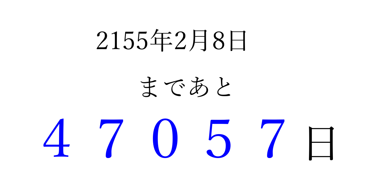 2155年2月8日(土)まで あと 99999 日です 追加すると、トップページからすぐ選べるようになります ※2026/04/08現在の結果です。 最新の状態に更新する ↓シェアして、タイムライン上にカウントダウンを表示しよう!↓ 📤 この結果を共有する Tweet シェア Threads Bluesky 別の日付でカウントダウン 2155年2月のカレンダー このページをブックマークに追加すると、いつでもカウントダウンを確認できます。 (PC: Ctrl+D / Mac: ⌘+D) hitome-notes.comでは以下のページも運営しています。 指定日と期間から日付を計算 | ガチャ確率計算・シミュレーション | プライバシー・ポリシー 運営者:Avocado