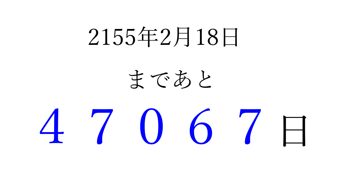 2155年2月18日(火)まで あと 99999 日です 追加すると、トップページからすぐ選べるようになります ※2026/04/08現在の結果です。 最新の状態に更新する ↓シェアして、タイムライン上にカウントダウンを表示しよう!↓ 📤 この結果を共有する Tweet シェア Threads Bluesky 別の日付でカウントダウン 2155年2月のカレンダー このページをブックマークに追加すると、いつでもカウントダウンを確認できます。 (PC: Ctrl+D / Mac: ⌘+D) hitome-notes.comでは以下のページも運営しています。 指定日と期間から日付を計算 | ガチャ確率計算・シミュレーション | プライバシー・ポリシー 運営者:Avocado