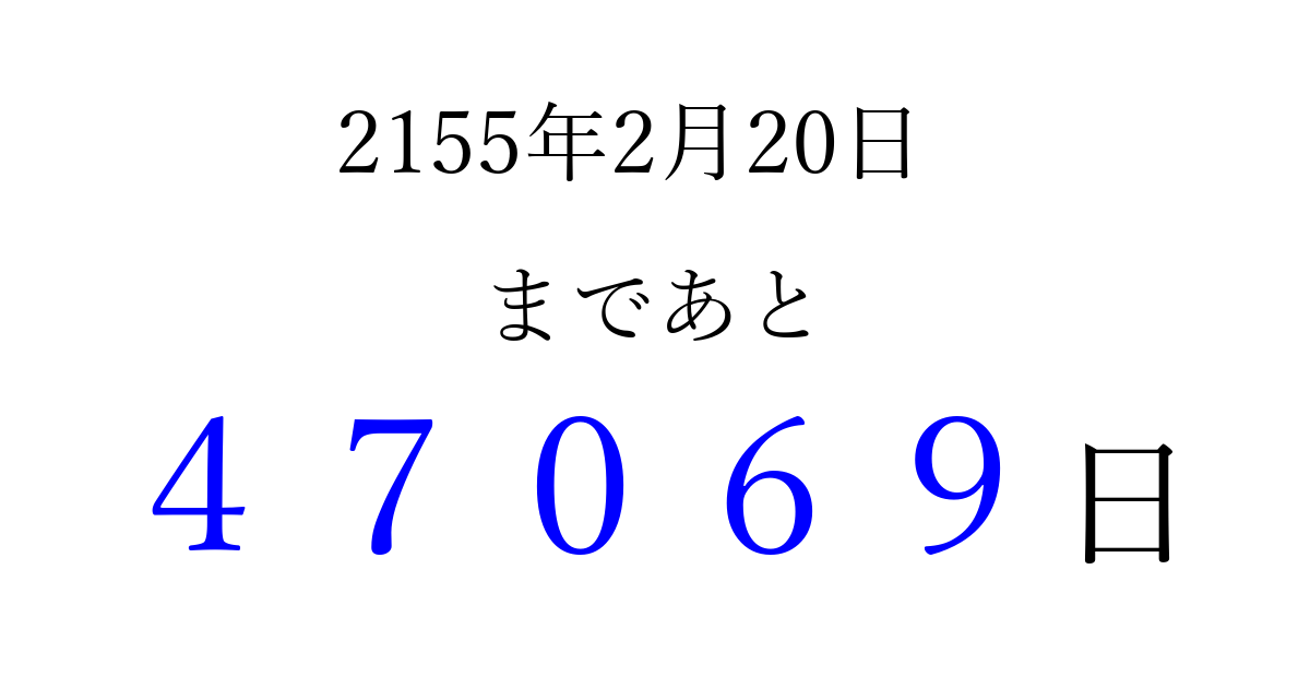2155年2月20日(木)まで あと 99999 日です 追加すると、トップページからすぐ選べるようになります ※2026/04/08現在の結果です。 最新の状態に更新する ↓シェアして、タイムライン上にカウントダウンを表示しよう!↓ 📤 この結果を共有する Tweet シェア Threads Bluesky 別の日付でカウントダウン 2155年2月のカレンダー このページをブックマークに追加すると、いつでもカウントダウンを確認できます。 (PC: Ctrl+D / Mac: ⌘+D) hitome-notes.comでは以下のページも運営しています。 指定日と期間から日付を計算 | ガチャ確率計算・シミュレーション | プライバシー・ポリシー 運営者:Avocado