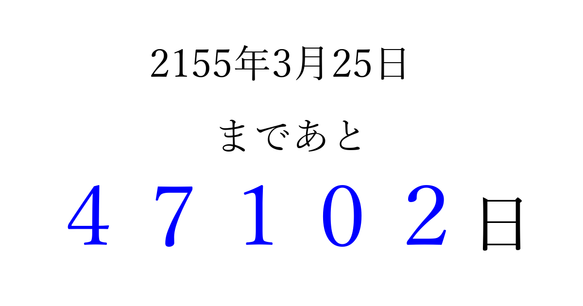 2155年3月25日(火)まで あと 99999 日です 追加すると、トップページからすぐ選べるようになります ※2026/04/08現在の結果です。 最新の状態に更新する ↓シェアして、タイムライン上にカウントダウンを表示しよう!↓ 📤 この結果を共有する Tweet シェア Threads Bluesky 別の日付でカウントダウン 2155年3月のカレンダー このページをブックマークに追加すると、いつでもカウントダウンを確認できます。 (PC: Ctrl+D / Mac: ⌘+D) hitome-notes.comでは以下のページも運営しています。 指定日と期間から日付を計算 | ガチャ確率計算・シミュレーション | プライバシー・ポリシー 運営者:Avocado
