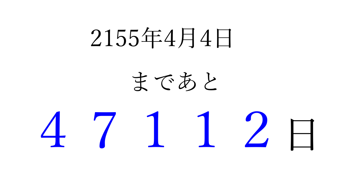 2155年4月4日(金)まで あと 99999 日です 追加すると、トップページからすぐ選べるようになります ※2026/04/08現在の結果です。 最新の状態に更新する ↓シェアして、タイムライン上にカウントダウンを表示しよう!↓ 📤 この結果を共有する Tweet シェア Threads Bluesky 別の日付でカウントダウン 2155年4月のカレンダー このページをブックマークに追加すると、いつでもカウントダウンを確認できます。 (PC: Ctrl+D / Mac: ⌘+D) hitome-notes.comでは以下のページも運営しています。 指定日と期間から日付を計算 | ガチャ確率計算・シミュレーション | プライバシー・ポリシー 運営者:Avocado