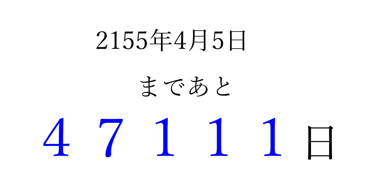 2155年4月5日(土)まで あと 99999 日です 追加すると、トップページからすぐ選べるようになります ※2026/04/10現在の結果です。 最新の状態に更新する ↓シェアして、タイムライン上にカウントダウンを表示しよう!↓ 📤 この結果を共有する Tweet シェア Threads Bluesky 別の日付でカウントダウン 2155年4月のカレンダー このページをブックマークに追加すると、いつでもカウントダウンを確認できます。 (PC: Ctrl+D / Mac: ⌘+D) hitome-notes.comでは以下のページも運営しています。 指定日と期間から日付を計算 | ガチャ確率計算・シミュレーション | プライバシー・ポリシー 運営者:Avocado