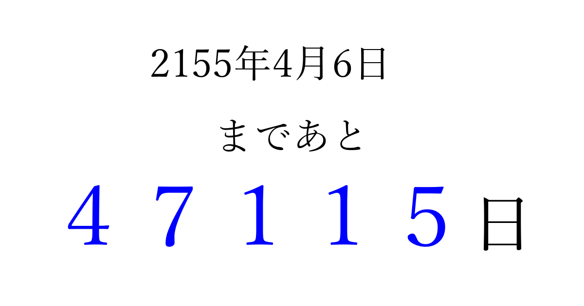 2155年4月6日(日)まで あと 99999 日です 追加すると、トップページからすぐ選べるようになります ※2026/04/07現在の結果です。 最新の状態に更新する ↓シェアして、タイムライン上にカウントダウンを表示しよう!↓ 📤 この結果を共有する Tweet シェア Threads Bluesky 別の日付でカウントダウン 2155年4月のカレンダー このページをブックマークに追加すると、いつでもカウントダウンを確認できます。 (PC: Ctrl+D / Mac: ⌘+D) hitome-notes.comでは以下のページも運営しています。 指定日と期間から日付を計算 | ガチャ確率計算・シミュレーション | プライバシー・ポリシー 運営者:Avocado