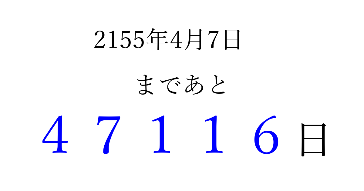 2155年4月7日(月)まで あと 99999 日です 追加すると、トップページからすぐ選べるようになります ※2026/04/07現在の結果です。 最新の状態に更新する ↓シェアして、タイムライン上にカウントダウンを表示しよう!↓ 📤 この結果を共有する Tweet シェア Threads Bluesky 別の日付でカウントダウン 2155年4月のカレンダー このページをブックマークに追加すると、いつでもカウントダウンを確認できます。 (PC: Ctrl+D / Mac: ⌘+D) hitome-notes.comでは以下のページも運営しています。 指定日と期間から日付を計算 | ガチャ確率計算・シミュレーション | プライバシー・ポリシー 運営者:Avocado