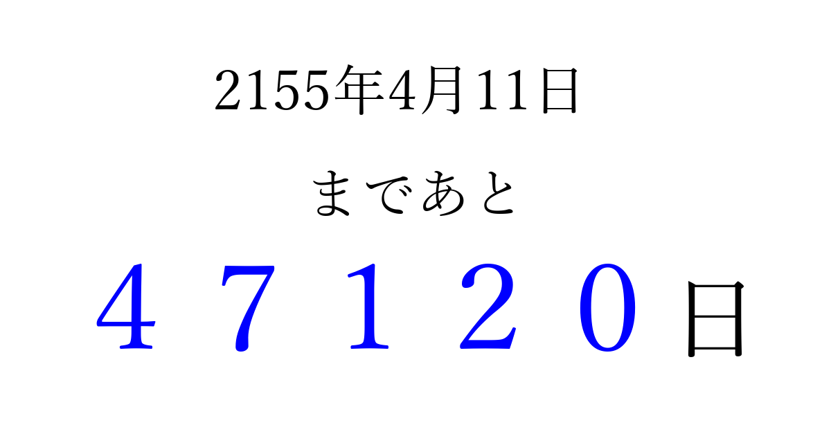2155年4月11日(金)まで あと 99999 日です 追加すると、トップページからすぐ選べるようになります ※2026/04/07現在の結果です。 最新の状態に更新する ↓シェアして、タイムライン上にカウントダウンを表示しよう!↓ 📤 この結果を共有する Tweet シェア Threads Bluesky 別の日付でカウントダウン 2155年4月のカレンダー このページをブックマークに追加すると、いつでもカウントダウンを確認できます。 (PC: Ctrl+D / Mac: ⌘+D) hitome-notes.comでは以下のページも運営しています。 指定日と期間から日付を計算 | ガチャ確率計算・シミュレーション | プライバシー・ポリシー 運営者:Avocado