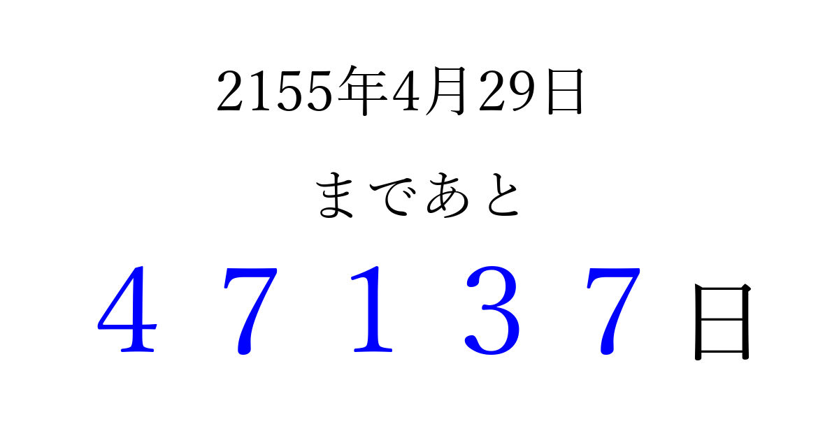 2155年4月29日(火)まで あと 99999 日です 追加すると、トップページからすぐ選べるようになります ※2026/04/08現在の結果です。 最新の状態に更新する ↓シェアして、タイムライン上にカウントダウンを表示しよう!↓ 📤 この結果を共有する Tweet シェア Threads Bluesky 別の日付でカウントダウン 2155年4月のカレンダー このページをブックマークに追加すると、いつでもカウントダウンを確認できます。 (PC: Ctrl+D / Mac: ⌘+D) hitome-notes.comでは以下のページも運営しています。 指定日と期間から日付を計算 | ガチャ確率計算・シミュレーション | プライバシー・ポリシー 運営者:Avocado