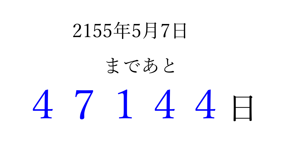 2155年5月7日(水)まで あと 99999 日です 追加すると、トップページからすぐ選べるようになります ※2026/04/09現在の結果です。 最新の状態に更新する ↓シェアして、タイムライン上にカウントダウンを表示しよう!↓ 📤 この結果を共有する Tweet シェア Threads Bluesky 別の日付でカウントダウン 2155年5月のカレンダー このページをブックマークに追加すると、いつでもカウントダウンを確認できます。 (PC: Ctrl+D / Mac: ⌘+D) hitome-notes.comでは以下のページも運営しています。 指定日と期間から日付を計算 | ガチャ確率計算・シミュレーション | プライバシー・ポリシー 運営者:Avocado