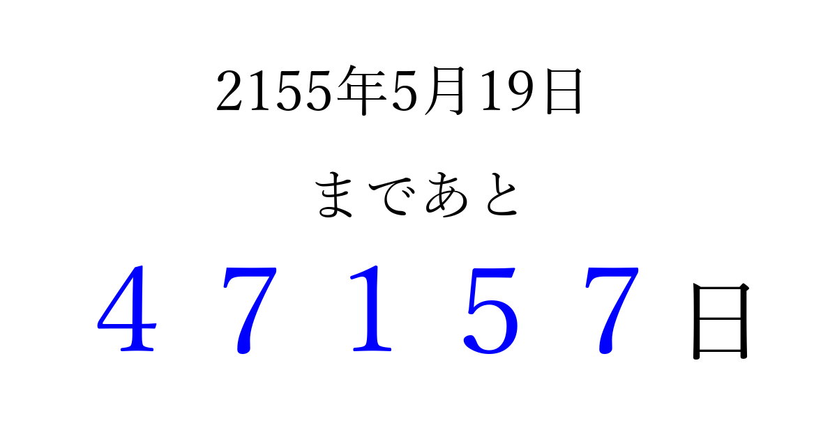2155年5月19日(月)まで あと 99999 日です 追加すると、トップページからすぐ選べるようになります ※2026/04/08現在の結果です。 最新の状態に更新する ↓シェアして、タイムライン上にカウントダウンを表示しよう!↓ 📤 この結果を共有する Tweet シェア Threads Bluesky 別の日付でカウントダウン 2155年5月のカレンダー このページをブックマークに追加すると、いつでもカウントダウンを確認できます。 (PC: Ctrl+D / Mac: ⌘+D) hitome-notes.comでは以下のページも運営しています。 指定日と期間から日付を計算 | ガチャ確率計算・シミュレーション | プライバシー・ポリシー 運営者:Avocado