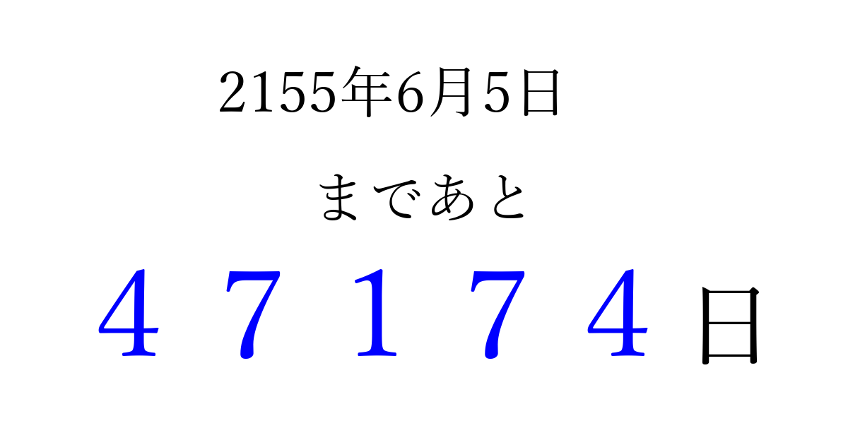 2155年6月5日(木)まで あと 99999 日です 追加すると、トップページからすぐ選べるようになります ※2026/04/08現在の結果です。 最新の状態に更新する ↓シェアして、タイムライン上にカウントダウンを表示しよう!↓ 📤 この結果を共有する Tweet シェア Threads Bluesky 別の日付でカウントダウン 2155年6月のカレンダー このページをブックマークに追加すると、いつでもカウントダウンを確認できます。 (PC: Ctrl+D / Mac: ⌘+D) hitome-notes.comでは以下のページも運営しています。 指定日と期間から日付を計算 | ガチャ確率計算・シミュレーション | プライバシー・ポリシー 運営者:Avocado