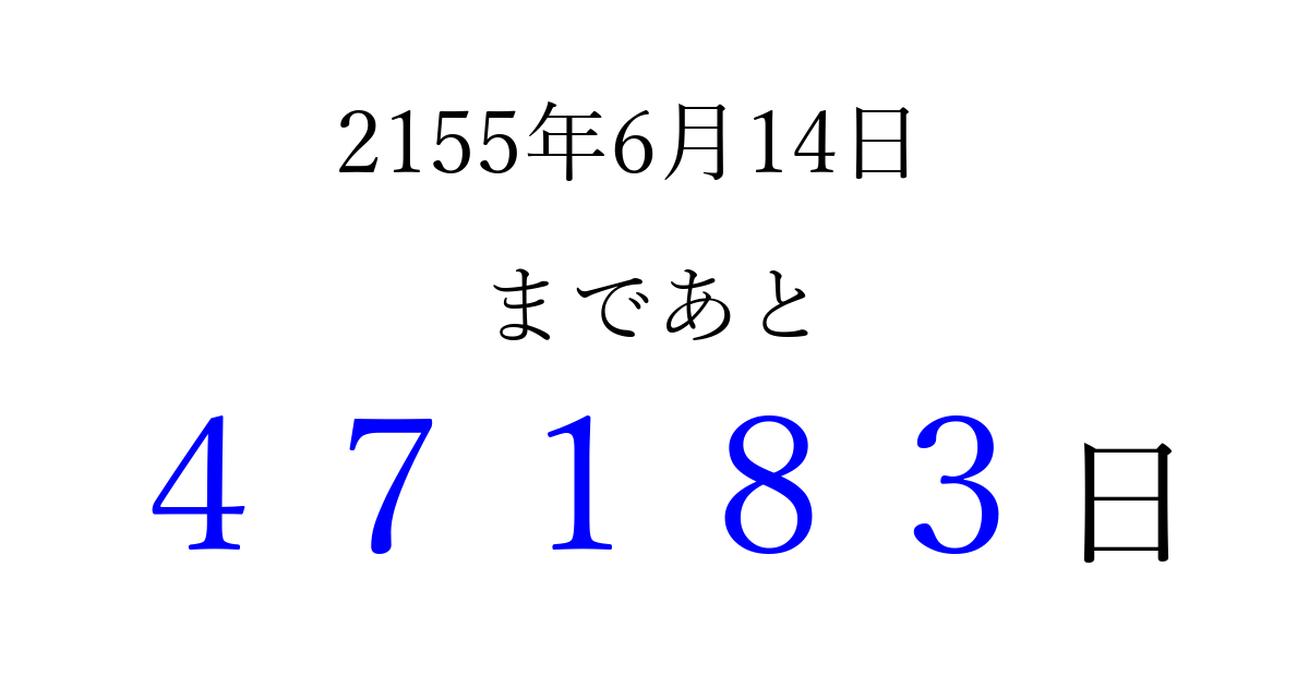 2155年6月14日(土)まで あと 99999 日です 追加すると、トップページからすぐ選べるようになります ※2026/04/08現在の結果です。 最新の状態に更新する ↓シェアして、タイムライン上にカウントダウンを表示しよう!↓ 📤 この結果を共有する Tweet シェア Threads Bluesky 別の日付でカウントダウン 2155年6月のカレンダー このページをブックマークに追加すると、いつでもカウントダウンを確認できます。 (PC: Ctrl+D / Mac: ⌘+D) hitome-notes.comでは以下のページも運営しています。 指定日と期間から日付を計算 | ガチャ確率計算・シミュレーション | プライバシー・ポリシー 運営者:Avocado