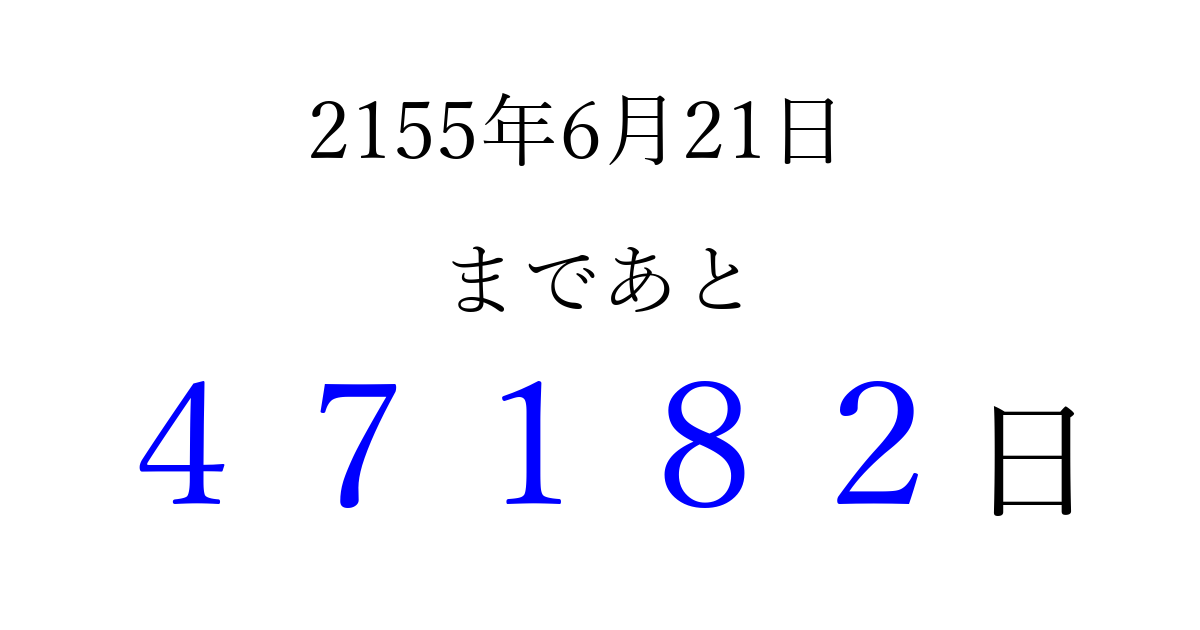 2155年6月21日(土)まで あと 99999 日です 追加すると、トップページからすぐ選べるようになります ※2026/04/16現在の結果です。 最新の状態に更新する ↓シェアして、タイムライン上にカウントダウンを表示しよう!↓ 📤 この結果を共有する Tweet シェア Threads Bluesky 別の日付でカウントダウン 2155年6月のカレンダー このページをブックマークに追加すると、いつでもカウントダウンを確認できます。 (PC: Ctrl+D / Mac: ⌘+D) hitome-notes.comでは以下のページも運営しています。 指定日と期間から日付を計算 | ガチャ確率計算・シミュレーション | プライバシー・ポリシー 運営者:Avocado