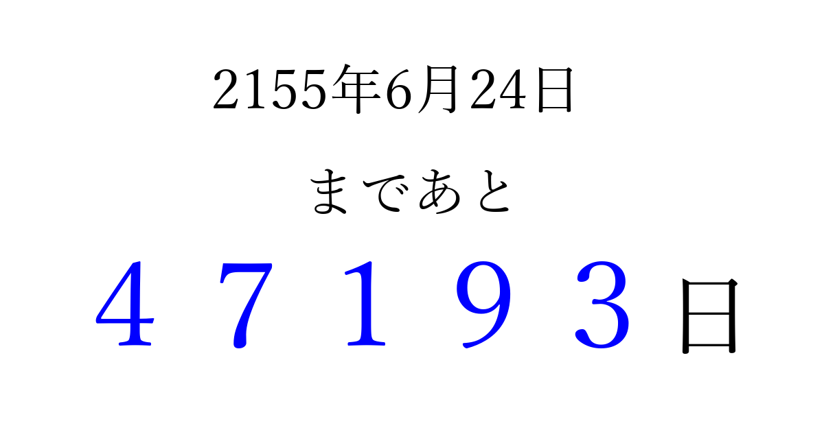 2155年6月24日(火)まで あと 99999 日です 追加すると、トップページからすぐ選べるようになります ※2026/04/08現在の結果です。 最新の状態に更新する ↓シェアして、タイムライン上にカウントダウンを表示しよう!↓ 📤 この結果を共有する Tweet シェア Threads Bluesky 別の日付でカウントダウン 2155年6月のカレンダー このページをブックマークに追加すると、いつでもカウントダウンを確認できます。 (PC: Ctrl+D / Mac: ⌘+D) hitome-notes.comでは以下のページも運営しています。 指定日と期間から日付を計算 | ガチャ確率計算・シミュレーション | プライバシー・ポリシー 運営者:Avocado