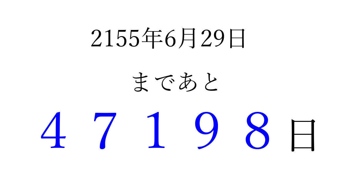 2155年6月29日(日)まで あと 99999 日です 追加すると、トップページからすぐ選べるようになります ※2026/04/08現在の結果です。 最新の状態に更新する ↓シェアして、タイムライン上にカウントダウンを表示しよう!↓ 📤 この結果を共有する Tweet シェア Threads Bluesky 別の日付でカウントダウン 2155年6月のカレンダー このページをブックマークに追加すると、いつでもカウントダウンを確認できます。 (PC: Ctrl+D / Mac: ⌘+D) hitome-notes.comでは以下のページも運営しています。 指定日と期間から日付を計算 | ガチャ確率計算・シミュレーション | プライバシー・ポリシー 運営者:Avocado