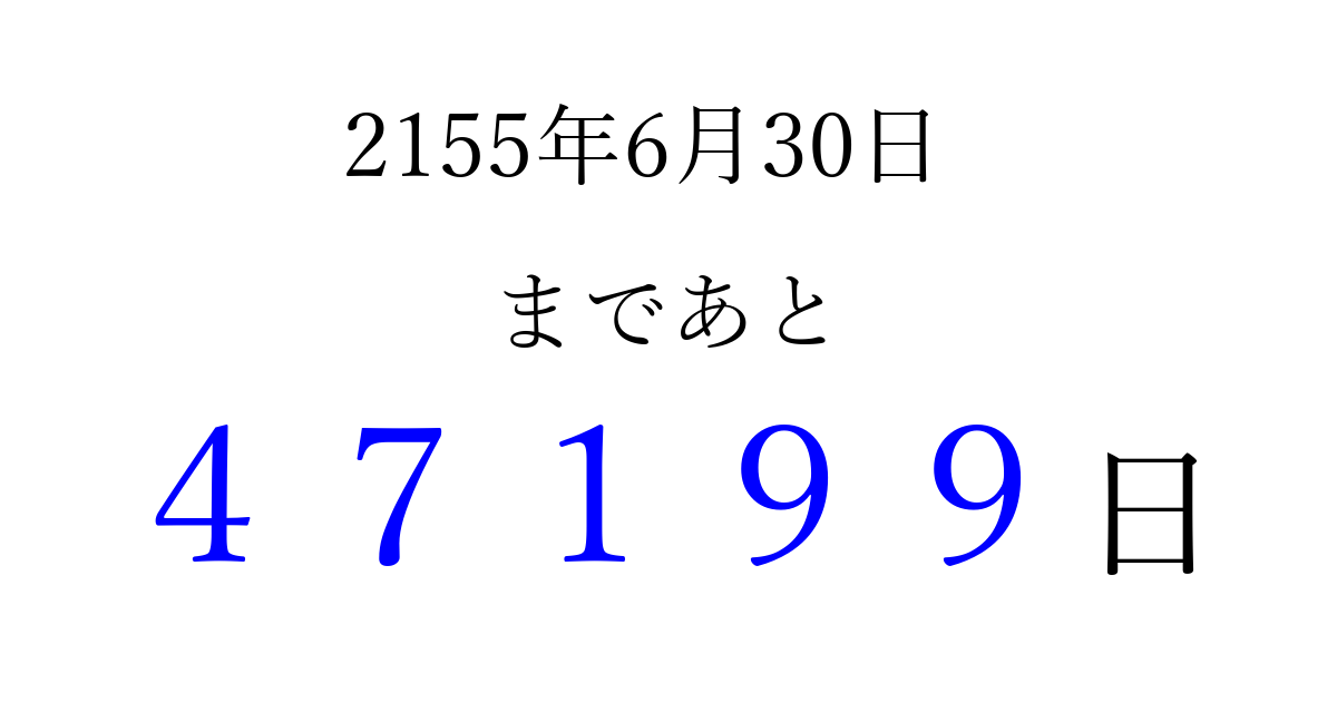 2155年6月30日(月)まで あと 99999 日です 追加すると、トップページからすぐ選べるようになります ※2026/04/08現在の結果です。 最新の状態に更新する ↓シェアして、タイムライン上にカウントダウンを表示しよう!↓ 📤 この結果を共有する Tweet シェア Threads Bluesky 別の日付でカウントダウン 2155年6月のカレンダー このページをブックマークに追加すると、いつでもカウントダウンを確認できます。 (PC: Ctrl+D / Mac: ⌘+D) hitome-notes.comでは以下のページも運営しています。 指定日と期間から日付を計算 | ガチャ確率計算・シミュレーション | プライバシー・ポリシー 運営者:Avocado