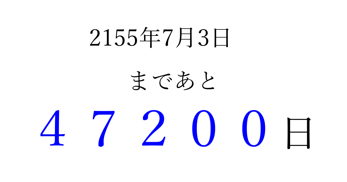 2155年7月3日(木)まで あと 99999 日です 追加すると、トップページからすぐ選べるようになります ※2026/04/10現在の結果です。 最新の状態に更新する ↓シェアして、タイムライン上にカウントダウンを表示しよう!↓ 📤 この結果を共有する Tweet シェア Threads Bluesky 別の日付でカウントダウン 2155年7月のカレンダー このページをブックマークに追加すると、いつでもカウントダウンを確認できます。 (PC: Ctrl+D / Mac: ⌘+D) hitome-notes.comでは以下のページも運営しています。 指定日と期間から日付を計算 | ガチャ確率計算・シミュレーション | プライバシー・ポリシー 運営者:Avocado