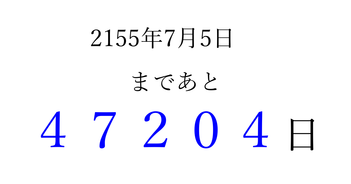 2155年7月5日(土)まで あと 99999 日です 追加すると、トップページからすぐ選べるようになります ※2026/04/08現在の結果です。 最新の状態に更新する ↓シェアして、タイムライン上にカウントダウンを表示しよう!↓ 📤 この結果を共有する Tweet シェア Threads Bluesky 別の日付でカウントダウン 2155年7月のカレンダー このページをブックマークに追加すると、いつでもカウントダウンを確認できます。 (PC: Ctrl+D / Mac: ⌘+D) hitome-notes.comでは以下のページも運営しています。 指定日と期間から日付を計算 | ガチャ確率計算・シミュレーション | プライバシー・ポリシー 運営者:Avocado