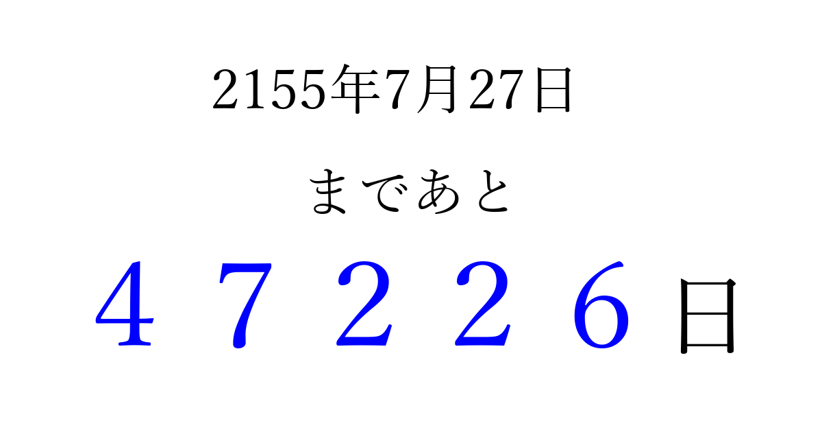 2155年7月27日(日)まで あと 99999 日です 追加すると、トップページからすぐ選べるようになります ※2026/04/08現在の結果です。 最新の状態に更新する ↓シェアして、タイムライン上にカウントダウンを表示しよう!↓ 📤 この結果を共有する Tweet シェア Threads Bluesky 別の日付でカウントダウン 2155年7月のカレンダー このページをブックマークに追加すると、いつでもカウントダウンを確認できます。 (PC: Ctrl+D / Mac: ⌘+D) hitome-notes.comでは以下のページも運営しています。 指定日と期間から日付を計算 | ガチャ確率計算・シミュレーション | プライバシー・ポリシー 運営者:Avocado