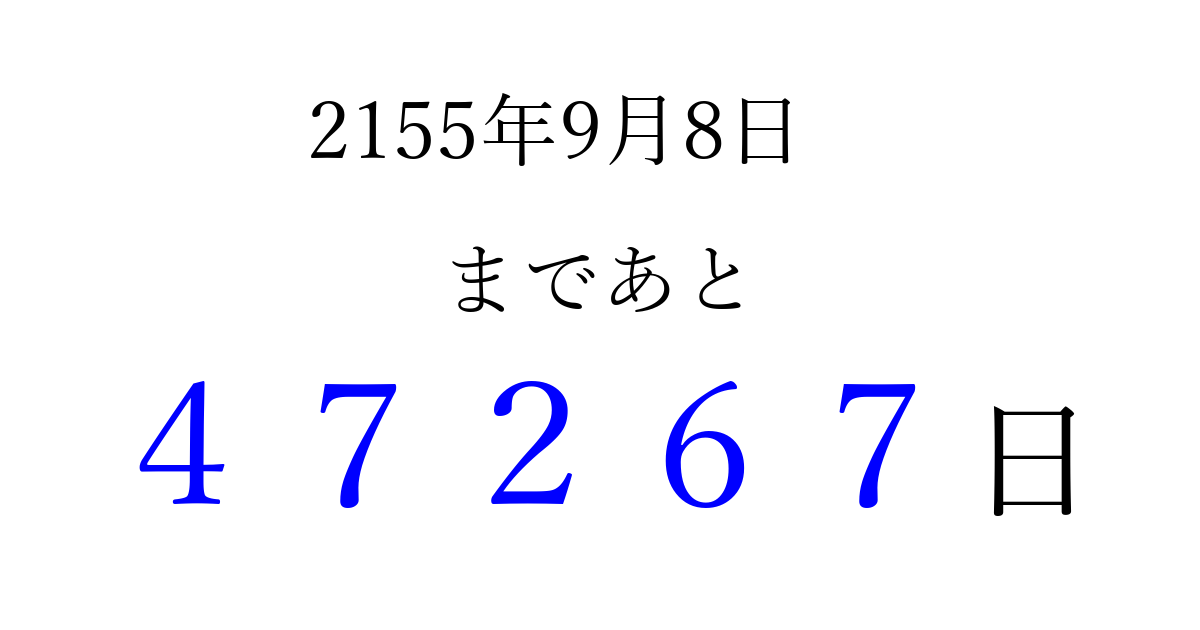 2155年9月8日(月)まで あと 99999 日です 追加すると、トップページからすぐ選べるようになります ※2026/04/10現在の結果です。 最新の状態に更新する ↓シェアして、タイムライン上にカウントダウンを表示しよう!↓ 📤 この結果を共有する Tweet シェア Threads Bluesky 別の日付でカウントダウン 2155年9月のカレンダー このページをブックマークに追加すると、いつでもカウントダウンを確認できます。 (PC: Ctrl+D / Mac: ⌘+D) hitome-notes.comでは以下のページも運営しています。 指定日と期間から日付を計算 | ガチャ確率計算・シミュレーション | プライバシー・ポリシー 運営者:Avocado