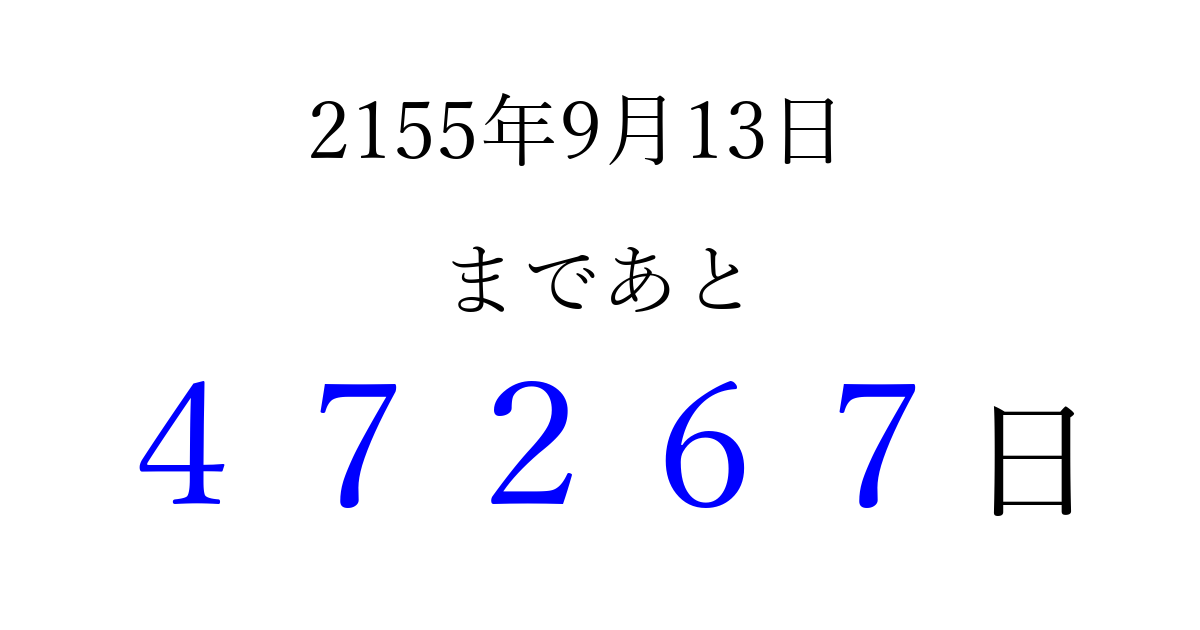 2155年9月13日(土)まで あと 99999 日です 追加すると、トップページからすぐ選べるようになります ※2026/04/15現在の結果です。 最新の状態に更新する ↓シェアして、タイムライン上にカウントダウンを表示しよう!↓ 📤 この結果を共有する Tweet シェア Threads Bluesky 別の日付でカウントダウン 2155年9月のカレンダー このページをブックマークに追加すると、いつでもカウントダウンを確認できます。 (PC: Ctrl+D / Mac: ⌘+D) hitome-notes.comでは以下のページも運営しています。 指定日と期間から日付を計算 | ガチャ確率計算・シミュレーション | プライバシー・ポリシー 運営者:Avocado