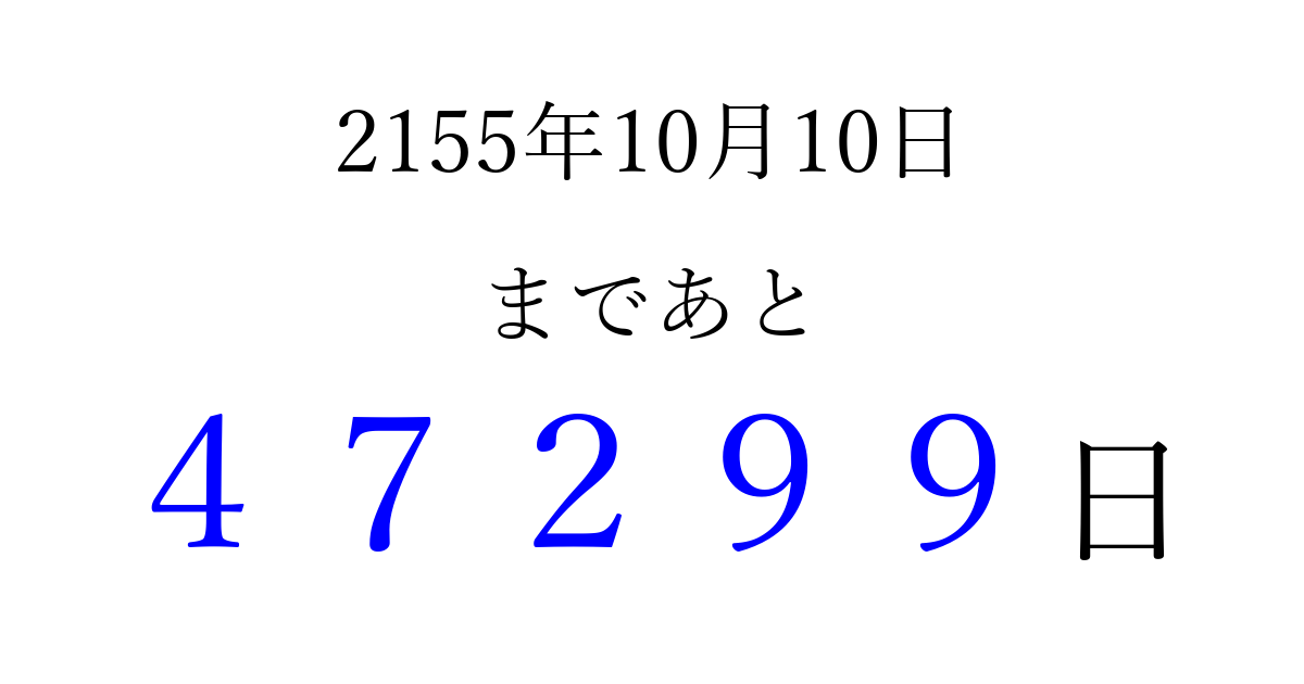 2155年10月10日(金)まで あと 99999 日です 追加すると、トップページからすぐ選べるようになります ※2026/04/10現在の結果です。 最新の状態に更新する ↓シェアして、タイムライン上にカウントダウンを表示しよう!↓ 📤 この結果を共有する Tweet シェア Threads Bluesky 別の日付でカウントダウン 2155年10月のカレンダー このページをブックマークに追加すると、いつでもカウントダウンを確認できます。 (PC: Ctrl+D / Mac: ⌘+D) hitome-notes.comでは以下のページも運営しています。 指定日と期間から日付を計算 | ガチャ確率計算・シミュレーション | プライバシー・ポリシー 運営者:Avocado