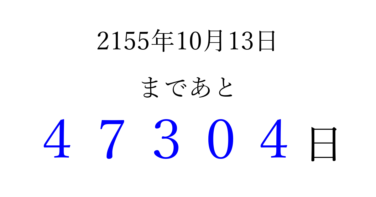 2155年10月13日(月)まで あと 99999 日です 追加すると、トップページからすぐ選べるようになります ※2026/04/08現在の結果です。 最新の状態に更新する ↓シェアして、タイムライン上にカウントダウンを表示しよう!↓ 📤 この結果を共有する Tweet シェア Threads Bluesky 別の日付でカウントダウン 2155年10月のカレンダー このページをブックマークに追加すると、いつでもカウントダウンを確認できます。 (PC: Ctrl+D / Mac: ⌘+D) hitome-notes.comでは以下のページも運営しています。 指定日と期間から日付を計算 | ガチャ確率計算・シミュレーション | プライバシー・ポリシー 運営者:Avocado