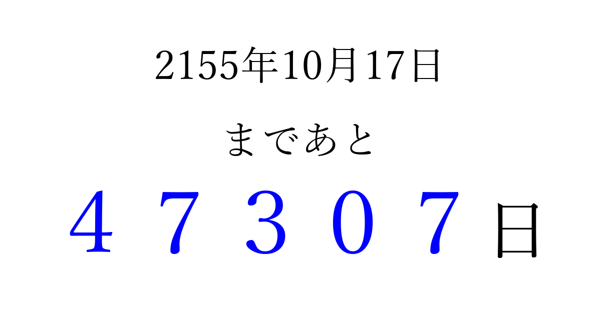 2155年10月17日(金)まで あと 99999 日です 追加すると、トップページからすぐ選べるようになります ※2026/04/09現在の結果です。 最新の状態に更新する ↓シェアして、タイムライン上にカウントダウンを表示しよう!↓ 📤 この結果を共有する Tweet シェア Threads Bluesky 別の日付でカウントダウン 2155年10月のカレンダー このページをブックマークに追加すると、いつでもカウントダウンを確認できます。 (PC: Ctrl+D / Mac: ⌘+D) hitome-notes.comでは以下のページも運営しています。 指定日と期間から日付を計算 | ガチャ確率計算・シミュレーション | プライバシー・ポリシー 運営者:Avocado