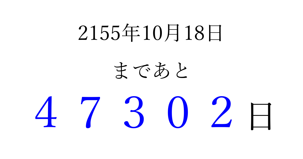2155年10月18日(土)まで あと 99999 日です 追加すると、トップページからすぐ選べるようになります ※2026/04/15現在の結果です。 最新の状態に更新する ↓シェアして、タイムライン上にカウントダウンを表示しよう!↓ 📤 この結果を共有する Tweet シェア Threads Bluesky 別の日付でカウントダウン 2155年10月のカレンダー このページをブックマークに追加すると、いつでもカウントダウンを確認できます。 (PC: Ctrl+D / Mac: ⌘+D) hitome-notes.comでは以下のページも運営しています。 指定日と期間から日付を計算 | ガチャ確率計算・シミュレーション | プライバシー・ポリシー 運営者:Avocado