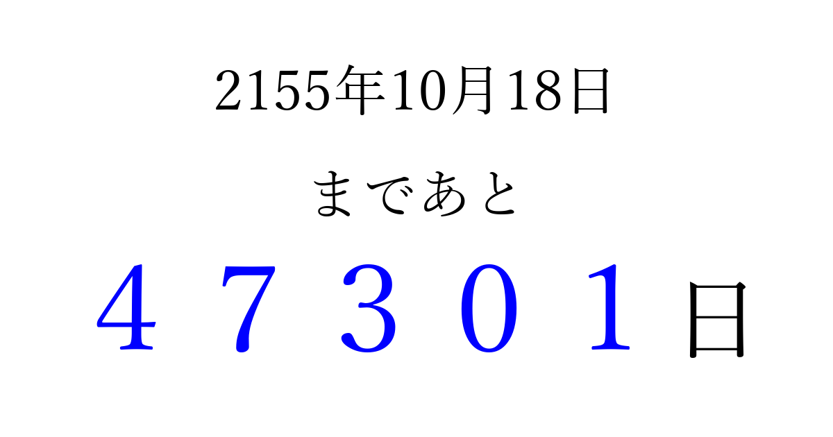 2155年10月18日(土)まで あと 99999 日です 追加すると、トップページからすぐ選べるようになります ※2026/04/16現在の結果です。 最新の状態に更新する ↓シェアして、タイムライン上にカウントダウンを表示しよう!↓ 📤 この結果を共有する Tweet シェア Threads Bluesky 別の日付でカウントダウン 2155年10月のカレンダー このページをブックマークに追加すると、いつでもカウントダウンを確認できます。 (PC: Ctrl+D / Mac: ⌘+D) hitome-notes.comでは以下のページも運営しています。 指定日と期間から日付を計算 | ガチャ確率計算・シミュレーション | プライバシー・ポリシー 運営者:Avocado