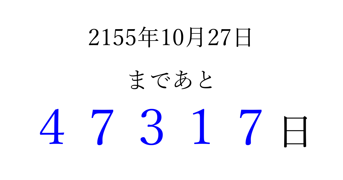 2155年10月27日(月)まで あと 99999 日です 追加すると、トップページからすぐ選べるようになります ※2026/04/09現在の結果です。 最新の状態に更新する ↓シェアして、タイムライン上にカウントダウンを表示しよう!↓ 📤 この結果を共有する Tweet シェア Threads Bluesky 別の日付でカウントダウン 2155年10月のカレンダー このページをブックマークに追加すると、いつでもカウントダウンを確認できます。 (PC: Ctrl+D / Mac: ⌘+D) hitome-notes.comでは以下のページも運営しています。 指定日と期間から日付を計算 | ガチャ確率計算・シミュレーション | プライバシー・ポリシー 運営者:Avocado