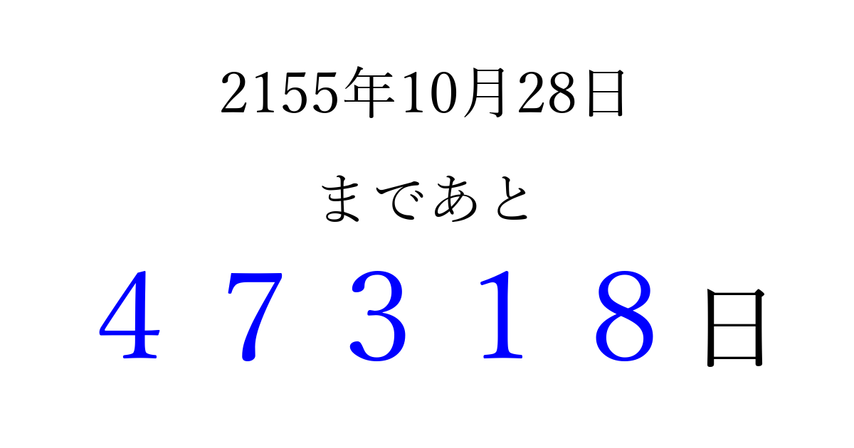 2155年10月28日(火)まで あと 99999 日です 追加すると、トップページからすぐ選べるようになります ※2026/04/09現在の結果です。 最新の状態に更新する ↓シェアして、タイムライン上にカウントダウンを表示しよう!↓ 📤 この結果を共有する Tweet シェア Threads Bluesky 別の日付でカウントダウン 2155年10月のカレンダー このページをブックマークに追加すると、いつでもカウントダウンを確認できます。 (PC: Ctrl+D / Mac: ⌘+D) hitome-notes.comでは以下のページも運営しています。 指定日と期間から日付を計算 | ガチャ確率計算・シミュレーション | プライバシー・ポリシー 運営者:Avocado