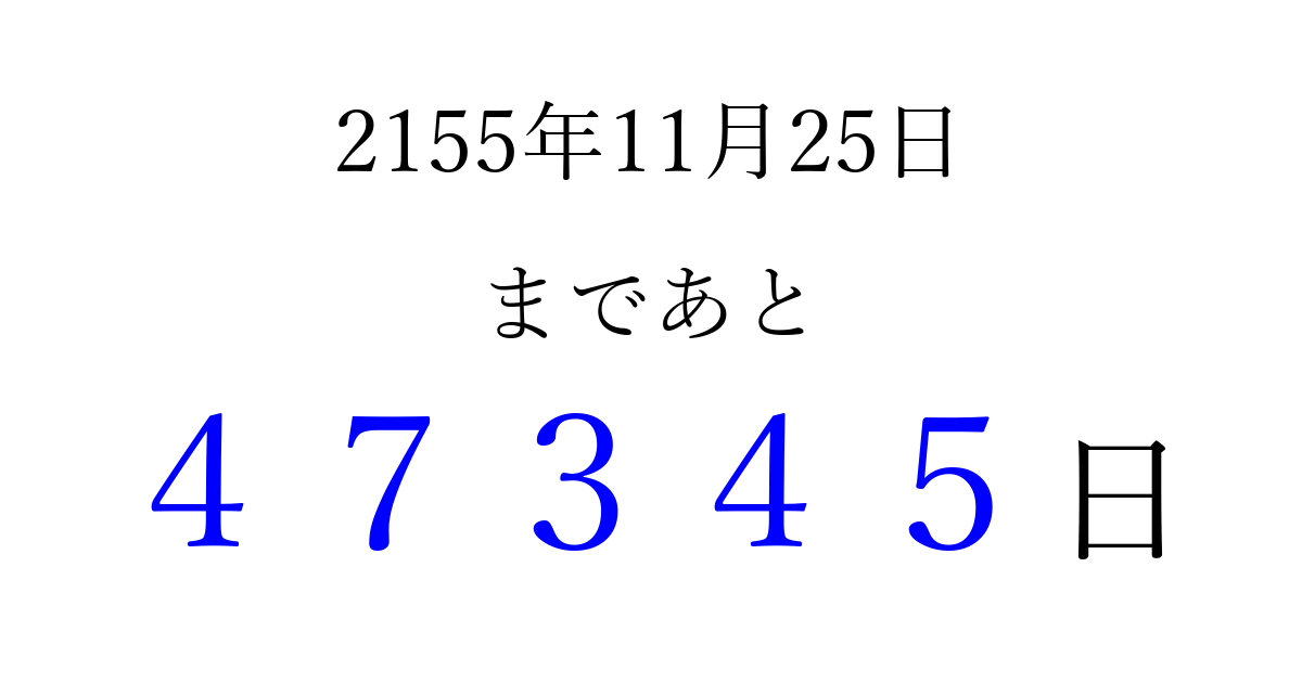 2155年11月25日(火)まで あと 99999 日です 追加すると、トップページからすぐ選べるようになります ※2026/04/10現在の結果です。 最新の状態に更新する ↓シェアして、タイムライン上にカウントダウンを表示しよう!↓ 📤 この結果を共有する Tweet シェア Threads Bluesky 別の日付でカウントダウン 2155年11月のカレンダー このページをブックマークに追加すると、いつでもカウントダウンを確認できます。 (PC: Ctrl+D / Mac: ⌘+D) hitome-notes.comでは以下のページも運営しています。 指定日と期間から日付を計算 | ガチャ確率計算・シミュレーション | プライバシー・ポリシー 運営者:Avocado