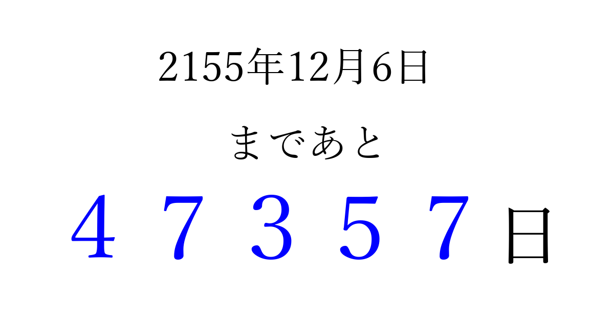 2155年12月6日(土)まで あと 99999 日です 追加すると、トップページからすぐ選べるようになります ※2026/04/09現在の結果です。 最新の状態に更新する ↓シェアして、タイムライン上にカウントダウンを表示しよう!↓ 📤 この結果を共有する Tweet シェア Threads Bluesky 別の日付でカウントダウン 2155年12月のカレンダー このページをブックマークに追加すると、いつでもカウントダウンを確認できます。 (PC: Ctrl+D / Mac: ⌘+D) hitome-notes.comでは以下のページも運営しています。 指定日と期間から日付を計算 | ガチャ確率計算・シミュレーション | プライバシー・ポリシー 運営者:Avocado