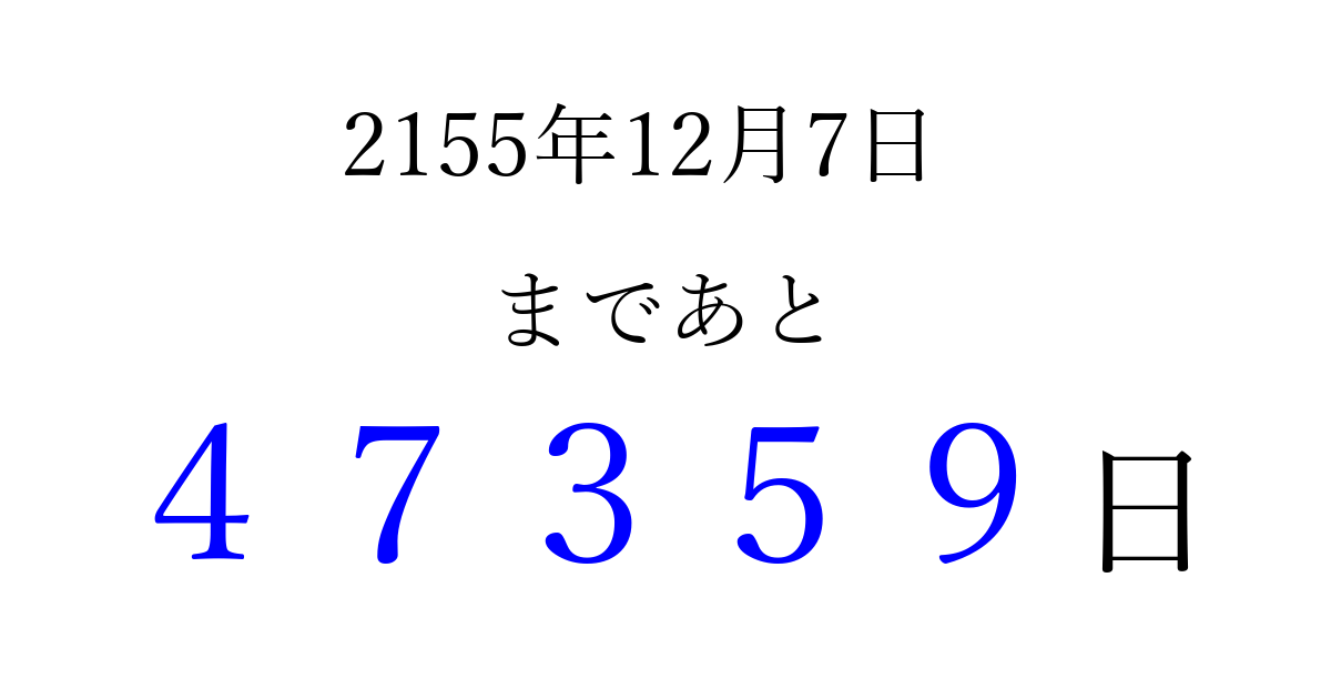 2155年12月7日(日)まで あと 99999 日です 追加すると、トップページからすぐ選べるようになります ※2026/04/08現在の結果です。 最新の状態に更新する ↓シェアして、タイムライン上にカウントダウンを表示しよう!↓ 📤 この結果を共有する Tweet シェア Threads Bluesky 別の日付でカウントダウン 2155年12月のカレンダー このページをブックマークに追加すると、いつでもカウントダウンを確認できます。 (PC: Ctrl+D / Mac: ⌘+D) hitome-notes.comでは以下のページも運営しています。 指定日と期間から日付を計算 | ガチャ確率計算・シミュレーション | プライバシー・ポリシー 運営者:Avocado