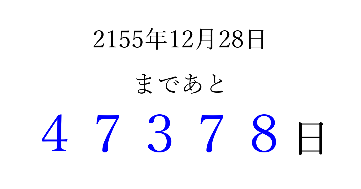 2155年12月28日(日)まで あと 99999 日です 追加すると、トップページからすぐ選べるようになります ※2026/04/10現在の結果です。 最新の状態に更新する ↓シェアして、タイムライン上にカウントダウンを表示しよう!↓ 📤 この結果を共有する Tweet シェア Threads Bluesky 別の日付でカウントダウン 2155年12月のカレンダー このページをブックマークに追加すると、いつでもカウントダウンを確認できます。 (PC: Ctrl+D / Mac: ⌘+D) hitome-notes.comでは以下のページも運営しています。 指定日と期間から日付を計算 | ガチャ確率計算・シミュレーション | プライバシー・ポリシー 運営者:Avocado
